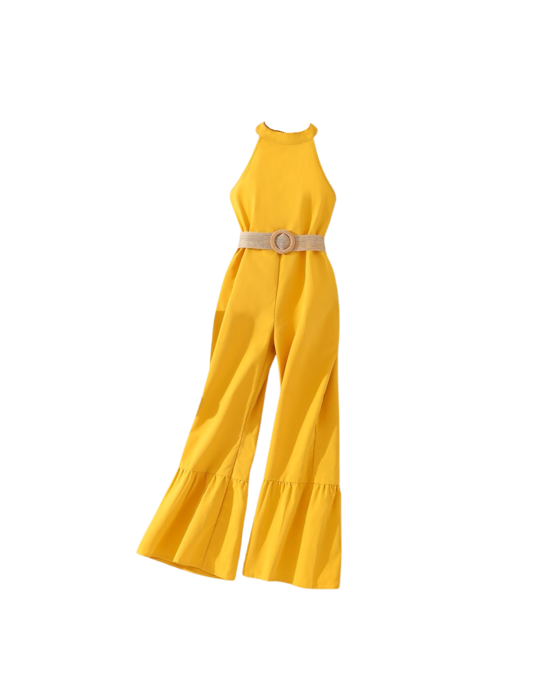 This jumpsuit features a stylish halter neckline that highlights your shoulders, giving it an elegant touch. The fit is relaxed and comfortable, with wide-leg pants that have a subtle flare at the hem, creating a flattering silhouette. The jumpsuit also comes with a unique wicker-style belt to cinch your waist, adding a trendy detail.